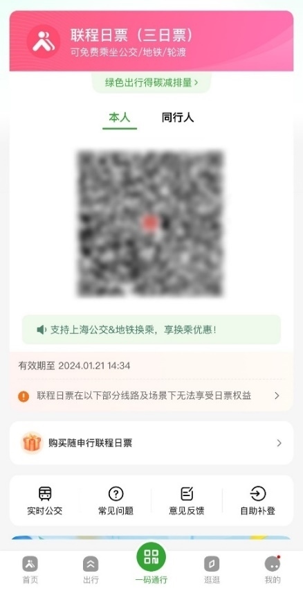 即日起,市民登錄上海市綠色出行一體化平臺(tái)“隨申行”APP,購(gòu)買(mǎi)并啟用“聯(lián)程日票”,即可在有效時(shí)間內(nèi)不限次乘坐上海地鐵、公交和輪渡。老人、小孩同行時(shí),支持為同行人購(gòu)買(mǎi)聯(lián)程日票。