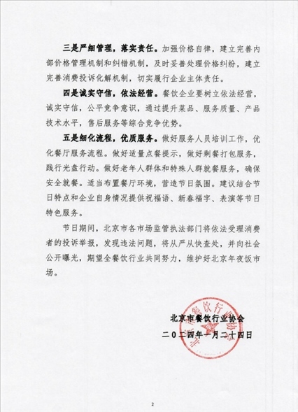 央視網(wǎng)消息:據(jù)北京市餐飲行業(yè)協(xié)會(huì)公眾號(hào)消息,據(jù)為進(jìn)一步規(guī)范北京年夜飯市場秩序,營造首都良好節(jié)日餐飲消費(fèi)環(huán)境,保障消費(fèi)者合法權(quán)益,讓廣大市民體驗(yàn)到優(yōu)質(zhì)的年夜飯服務(wù)。同時(shí),更好地杜絕虛假價(jià)格、價(jià)質(zhì)不符、不合理定價(jià)、不合規(guī)收費(fèi)等不規(guī)范行為,北京市餐飲行業(yè)協(xié)會(huì)特發(fā)布如下倡議:
