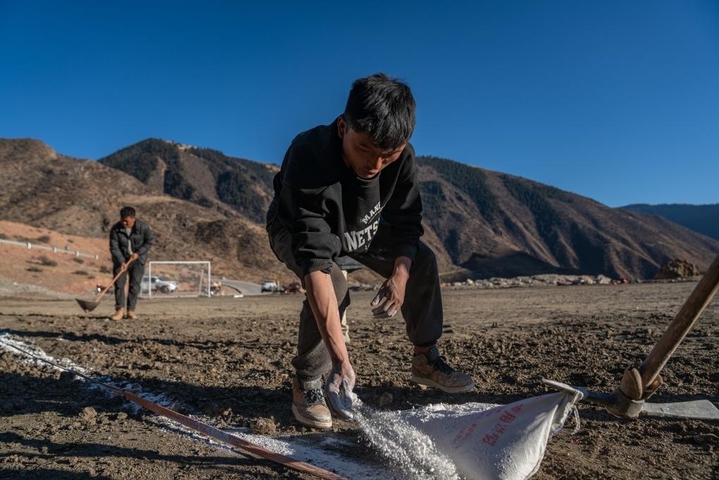 嘎瑪群美(中)和球員們正在平整球場(1月20日攝)