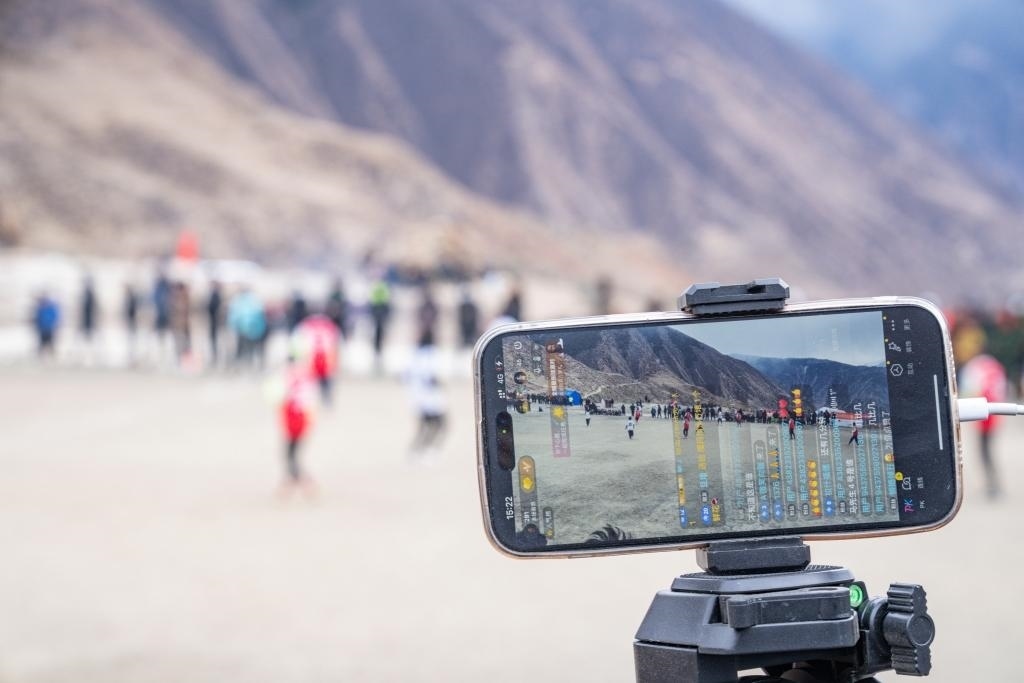 在馬利村的足球場邊,一名村民用手機(jī)直播比賽(1月21日攝)