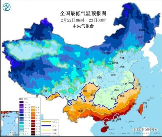 全國最低氣溫預(yù)報圖(2月22日8時-23日8時)