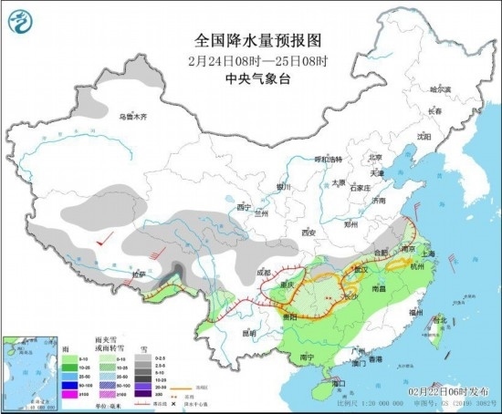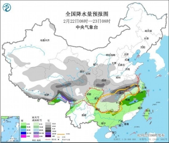 全國降水量預(yù)報圖(2月22日8時-23日8時)