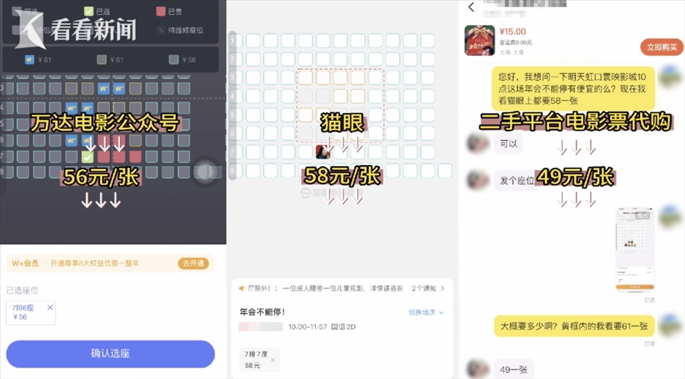 為了求證這一說法,記者來到了網(wǎng)友爆料的這家電影院,并提前通過三種渠道在線上購入了同天、同電影院、同場次、同排位置的三張電影票,分別花費了56元、58元、49元。