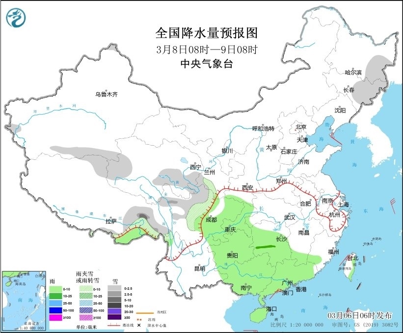 3月8日08時(shí)至9日08時(shí),東北地區(qū)東部、西藏東部、青海東部、甘肅南部、川西高原北部等地部分地區(qū)有小雪或雨夾雪,其中,西藏東部等地部分地區(qū)有中到大雪。江南南部和西部、西南地區(qū)東部、華南等地部分地區(qū)有小雨,其中,湖南中西部等地部分地區(qū)有中雨(見圖3)。