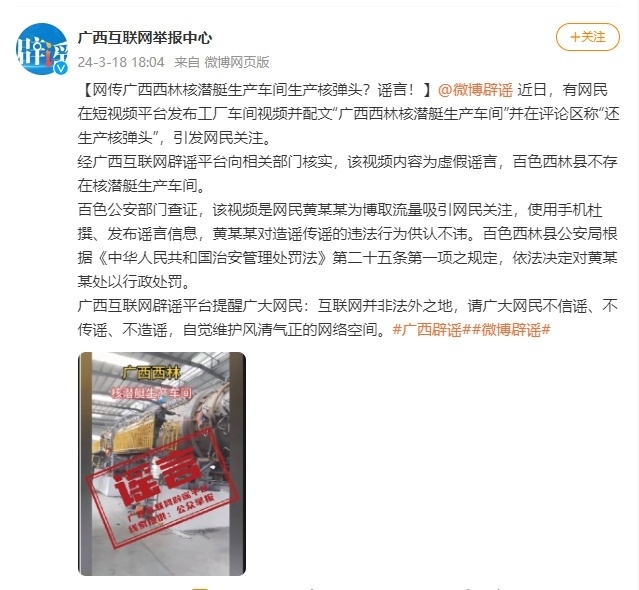 ·廣西互聯(lián)網(wǎng)舉報中心:“廣西西林核潛艇生產(chǎn)車間生產(chǎn)核彈頭”系謠言。