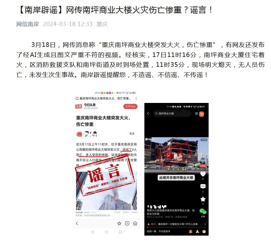 ·網(wǎng)傳重慶南坪商業(yè)大樓突發(fā)大火傷亡慘重?官方辟謠:無人員傷亡,未發(fā)生次生事故。