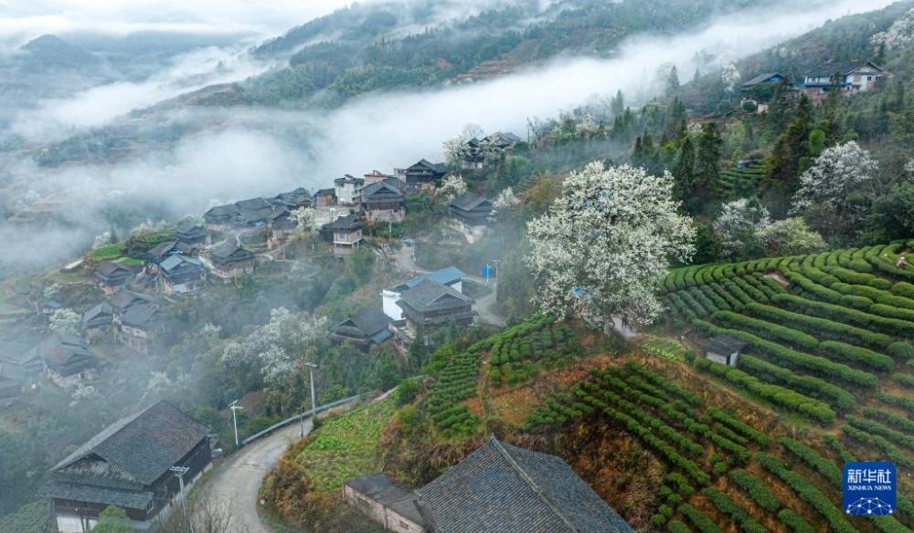 春到茶鄉(xiāng),廣西三江侗族自治縣的村寨、山花與茶園構(gòu)成美麗的田園圖畫。?