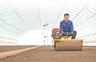 黑龍江北大荒農(nóng)業(yè)股份有限公司友誼分公司智慧農(nóng)場(chǎng)育秧大棚里,職工在進(jìn)行水稻育秧前的地面平整作業(yè)。新華社記者 王 松攝