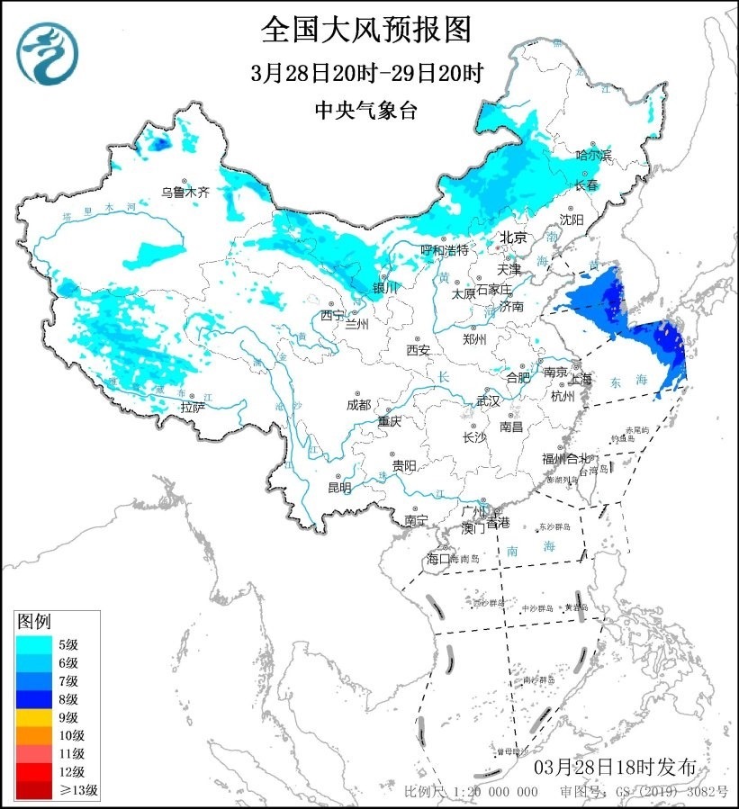 預(yù)計,3月28日20時至29日20時,內(nèi)蒙古大部、吉林西部、遼寧南部、甘肅東部、寧夏北部等地有5~6級、陣風(fēng)7~9級風(fēng);黃海中部和南部海域、東海東北部海域?qū)⒂?~8級、陣風(fēng)9級風(fēng),其中東海東北部的部分海域風(fēng)力可達9級、陣風(fēng)10級。