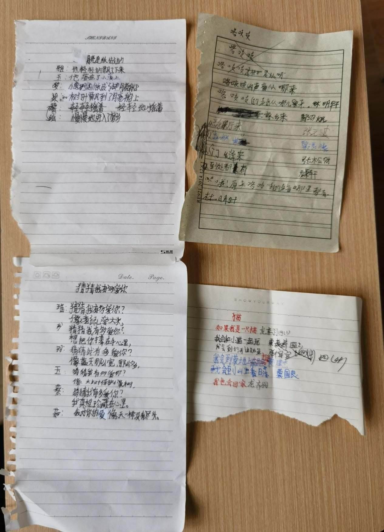 11歲的龍夢瑤是詩班里高產(chǎn)的一個。她在本子上擠擠挨挨寫一團(tuán)字,一把撕下整頁,塞給李柏霖。這樣的紙片,李柏霖一天要收到幾十張。大大小小夾在書里,她晚上批改完,第二天再拿回學(xué)校,在課堂上分享。她估計,孩子們寫的詩已經(jīng)超過2000首。