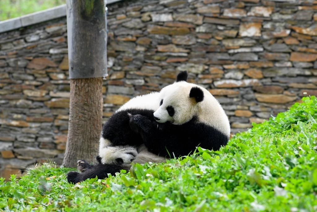 2022年4月24日,在中國大熊貓保護(hù)研究中心臥龍神樹坪基地內(nèi),一只大熊貓和大熊貓幼崽在玩耍。新華社記者 胥冰潔 攝