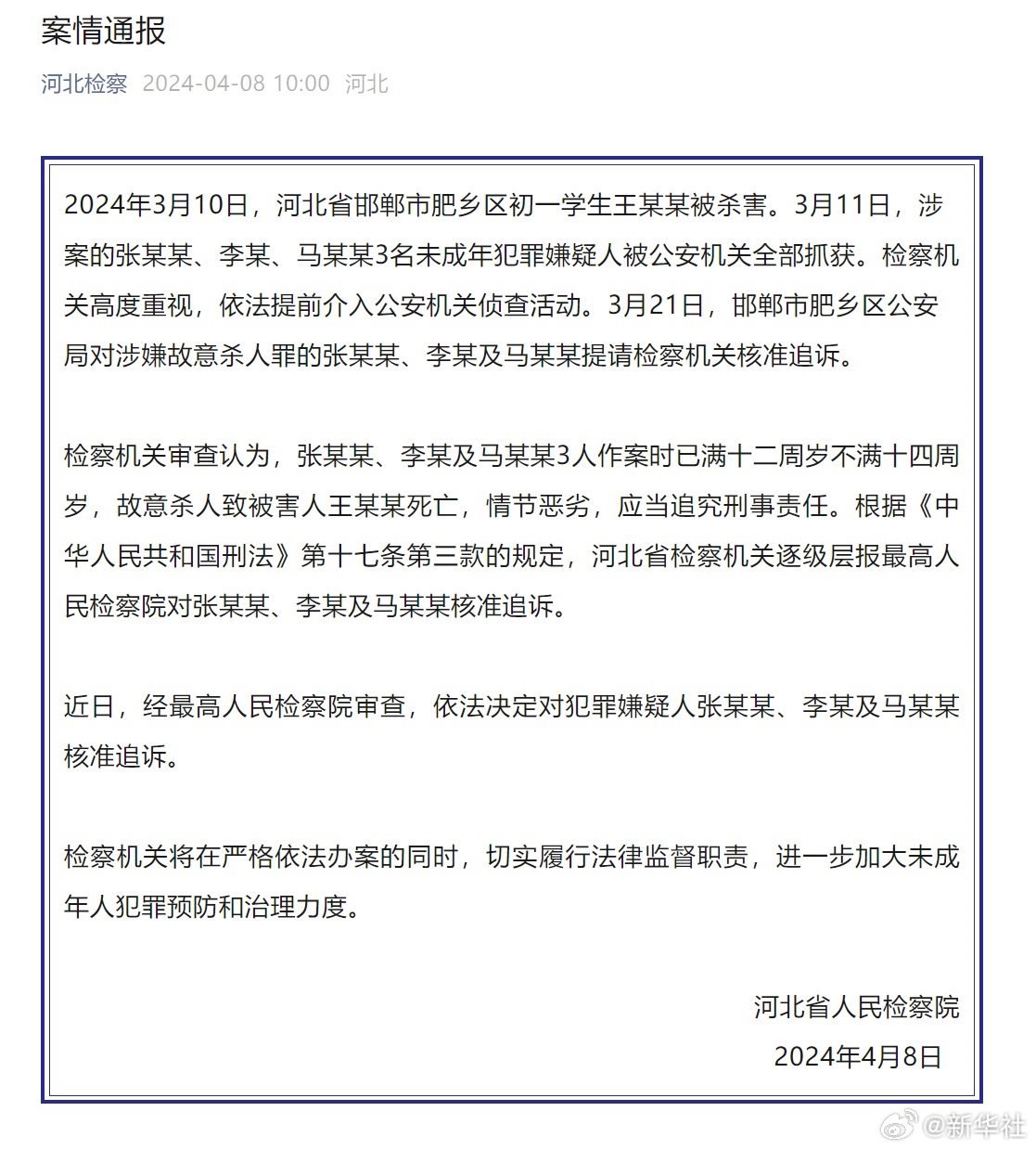 2024年3月10日,河北省邯鄲市肥鄉(xiāng)區(qū)初一學(xué)生王某某被殺害。3月11日,涉案的張某某、李某、馬某某3名未成年犯罪嫌疑人被公安機(jī)關(guān)全部抓獲。檢察機(jī)關(guān)高度重視,依法提前介入公安機(jī)關(guān)偵查活動(dòng)。3月21日,邯鄲市肥鄉(xiāng)區(qū)公安局對(duì)涉嫌故意殺人罪的張某某、李某及馬某某提請(qǐng)檢察機(jī)關(guān)核準(zhǔn)追訴。