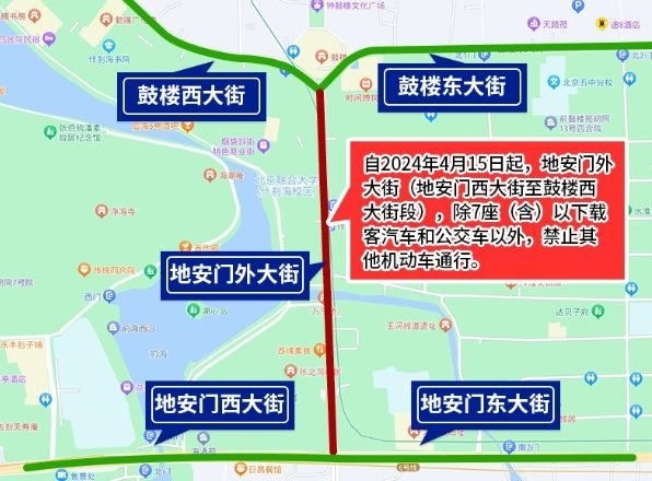 為確保全國重點(diǎn)文物保護(hù)單位“大運(yùn)河——玉河故道(澄清上閘含萬寧橋)”的文物安全與交通安全,根據(jù)文物保護(hù)和道路交通安全有關(guān)法律法規(guī)規(guī)定,決定自2024年4月15日起,地安門外大街(地安門西大街至鼓樓西大街段),除7座(含)以下載客汽車和公交車以外,禁止其他機(jī)動車通行。