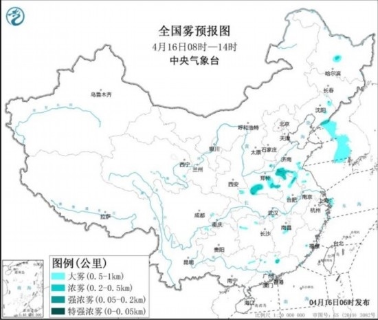 預(yù)計,4月16日早晨至上午,黃海東北部和中東部海域、浙江東北部沿岸的部分海域?qū)⒂心芤姸炔蛔?公里的大霧,此外,山東南部、河南東部和南部、江蘇北部、安徽北部、湖北西北部、浙江東部、福建東部、湖南北部、江西北部、廣東北部、遼寧東部等地的部分地區(qū)有大霧,其中河南南部、山東南部、安徽北部、浙江東部沿海局地有能見度不足200米的強濃霧。中央氣象臺4月16日06時繼續(xù)發(fā)布大霧黃色預(yù)警。