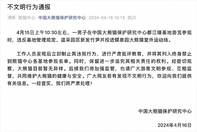 央視網(wǎng)消息:4月16日,中國大熊貓保護研究中心發(fā)布不文明行為通報:4月15日上午10:30左右,一男子在中國大熊貓保護研究中心都江堰基地游覽參觀時,違反基地管理規(guī)定,盜采園區(qū)新發(fā)竹筍并投進蝶泉園大熊貓室外運動場。