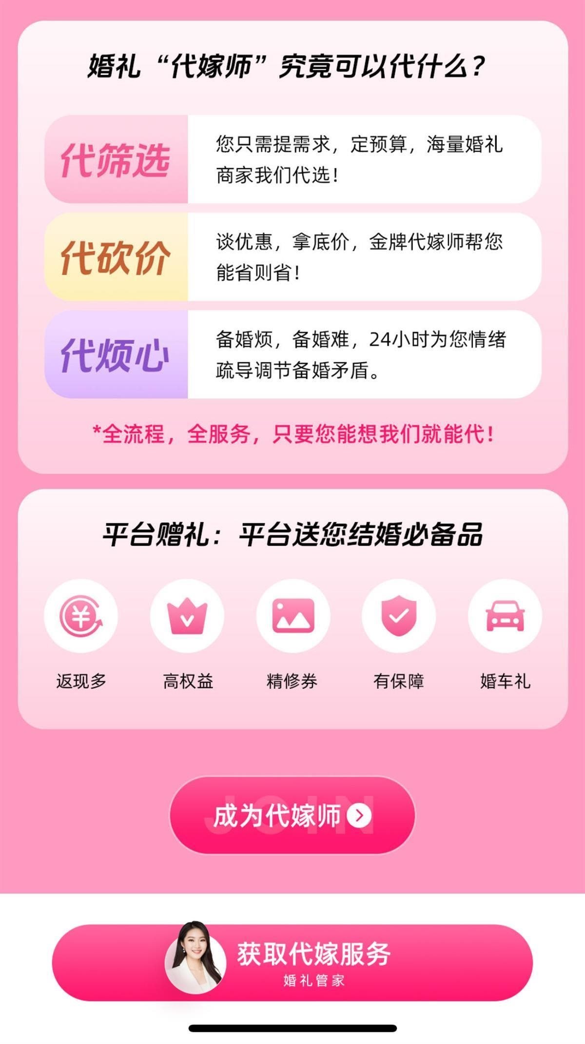 該頁面還宣傳稱,代嫁師可以“代篩選”“代砍價”“代煩心”,并且還有一行字強(qiáng)調(diào):“全流程,全服務(wù),只要您能想,代嫁師就能代?!?/p>