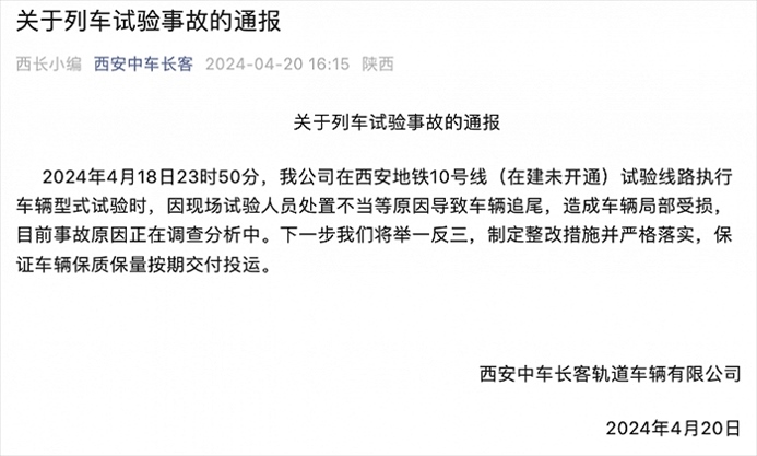 央視網(wǎng)消息:據(jù)西安中車長客官微消息,西安中車長客軌道車輛有限公司4月20日通報,4月18日23時50分,公司在西安地鐵10號線(在建未開通)試驗線路執(zhí)行車輛型式試驗時,因現(xiàn)場試驗人員處置不當?shù)仍驅(qū)е萝囕v追尾,造成車輛局部受損,目前事故原因正在調(diào)查分析中。下一步將舉一反三,制定整改措施并嚴格落實,保證車輛保質(zhì)保量按期交付投運。