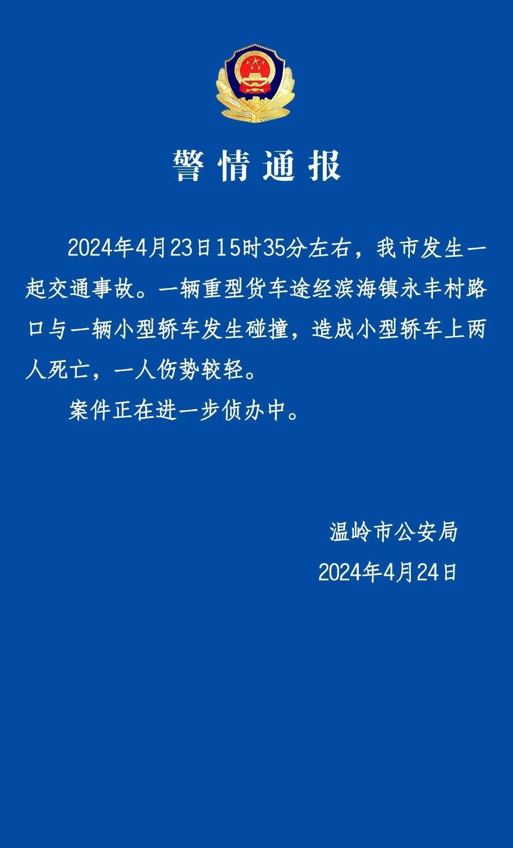 央視網(wǎng)消息:溫嶺市公安局4月24日發(fā)布警情通報(bào):2024年4月23日15時(shí)35分左右,我市發(fā)生一起交通事故。一輛重型貨車(chē)途經(jīng)濱海鎮(zhèn)永豐村路口與一輛小型轎車(chē)發(fā)生碰撞,造成小型轎車(chē)上兩人死亡,一人傷勢(shì)較輕。