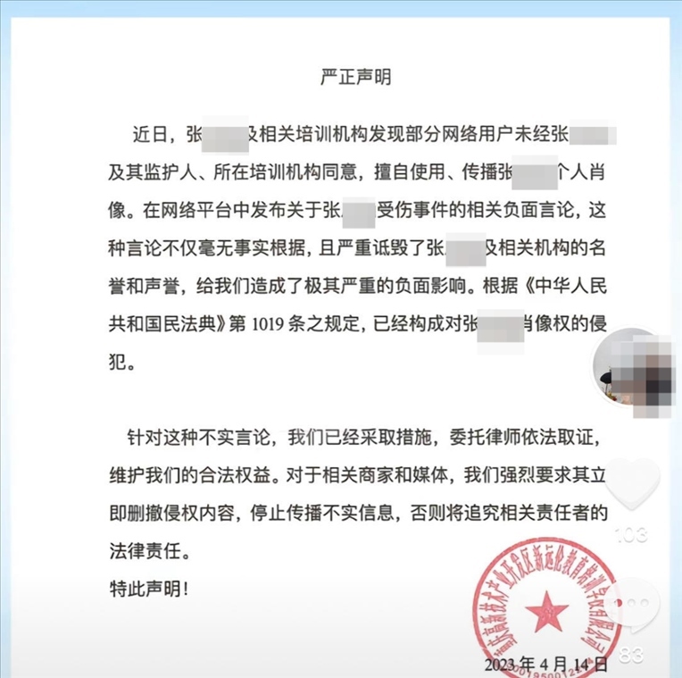 紅星新聞注意到,遠(yuǎn)倫舞蹈帳號2023年2023年4月曾發(fā)布一則聲明。落款為重慶高新技術(shù)產(chǎn)業(yè)開發(fā)區(qū)新遠(yuǎn)倫教育培訓(xùn)學(xué)校有限公司(下稱遠(yuǎn)倫培訓(xùn)學(xué)校)。聲明稱,近日,張某涵及相關(guān)培訓(xùn)機(jī)構(gòu)發(fā)現(xiàn)部分網(wǎng)絡(luò)用戶未經(jīng)張某涵及其監(jiān)護(hù)人、所在培訓(xùn)機(jī)構(gòu)同意,擅自使用、傳播張某涵個(gè)人肖像。在網(wǎng)絡(luò)平臺中發(fā)布關(guān)于受傷事件的相關(guān)負(fù)面言論,這種言論不僅毫無事實(shí)根據(jù),且嚴(yán)重詆毀了張某涵及相關(guān)機(jī)構(gòu)的名譽(yù)和聲譽(yù),給公司造成了極其嚴(yán)重的負(fù)面影響,已經(jīng)構(gòu)成對張某涵肖像權(quán)的侵犯。