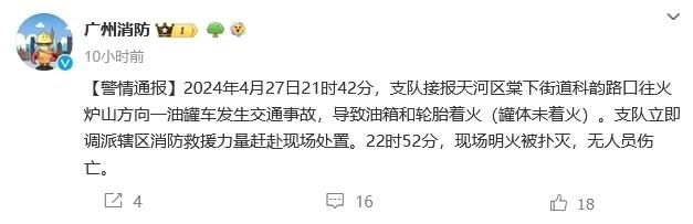 中新網(wǎng)4月28日電 據(jù)廣州消防微博消息,2024年4月27日21時42分,支隊接報天河區(qū)棠下街道科韻路口往火爐山方向一油罐車發(fā)生交通事故,導(dǎo)致油箱和輪胎著火(罐體未著火)。支隊立即調(diào)派轄區(qū)消防救援力量趕赴現(xiàn)場處置。22時52分,現(xiàn)場明火被撲滅,無人員傷亡。