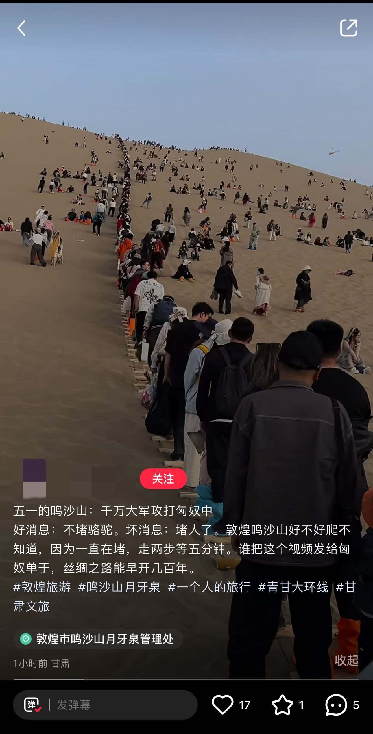 還有甘肅的網(wǎng)友在發(fā)布的關于敦煌鳴沙山的筆記中稱:“好消息:不堵駱駝。壞消息:堵人了……走兩步路等五分鐘?!?/p>