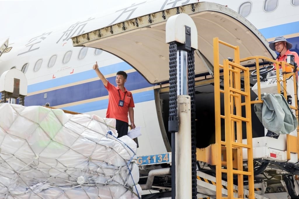 2024年“五一”期間,廣州白云機場,南航裝卸員侯華偉與同事一起裝載航班行李和貨物。(南航供圖)