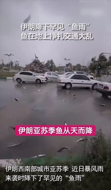 ·近日,伊朗亞蘇季市暴風(fēng)雨來襲時,天空降下罕見“魚雨”。