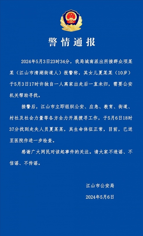 ·浙江衢州警方:走失3天10歲女孩已找到,生命體征正常。