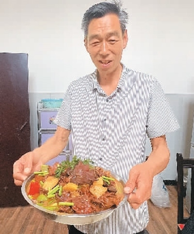 盧守峰展示燒制的新疆大盤雞。本報(bào)記者 趙 昊攝