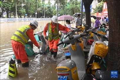 5月19日,工作人員在南寧東葛路開(kāi)展排水作業(yè)。新華社記者 陸波岸 攝