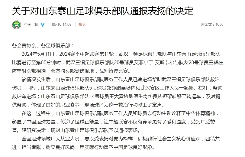 ·幫助救治武漢三鎮(zhèn)足球俱樂(lè)部隊(duì)傷員,中國(guó)足協(xié)通報(bào)表?yè)P(yáng)山東泰山俱樂(lè)部。