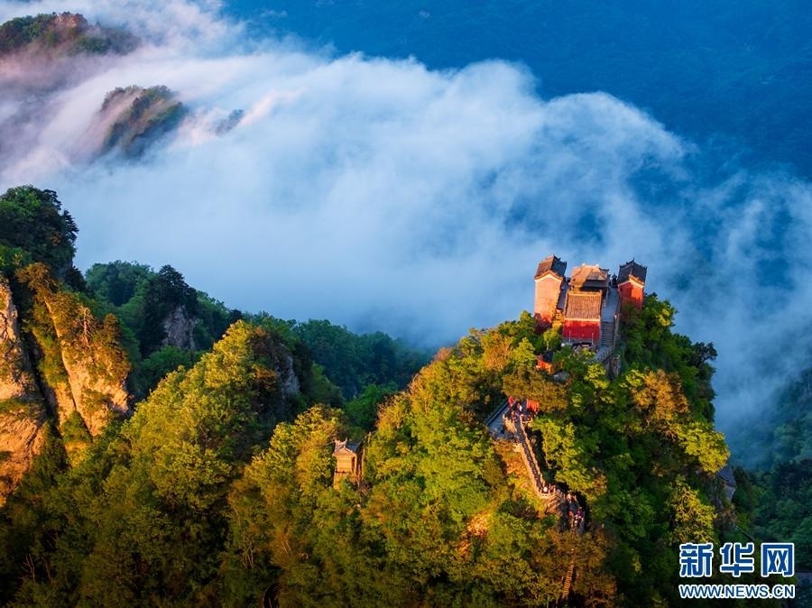 五月的武當(dāng)山,云霧升騰,浩瀚無(wú)垠,靈性的古建筑若隱若現(xiàn),如同水墨畫卷,勝似仙山瓊閣,氣勢(shì)磅礴,蔚為壯觀,給游客帶來(lái)無(wú)限遐想與向往。