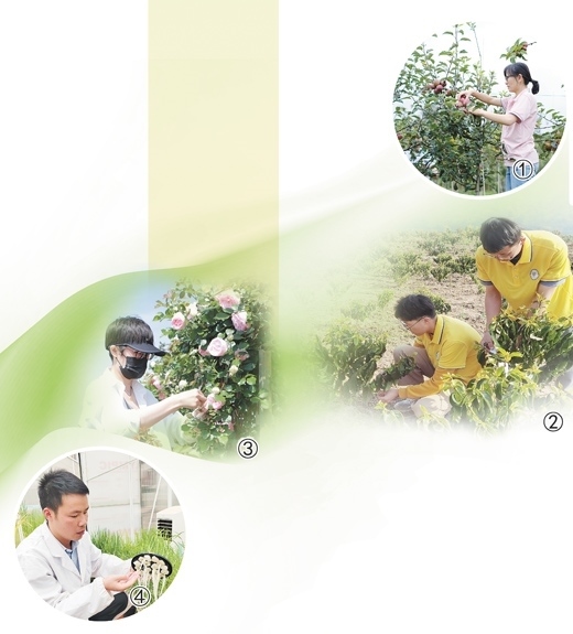 圖①:劉丹丹在調(diào)查蘋果病害情況。 圖②:咖啡團(tuán)隊(duì)的學(xué)生們?cè)诳Х忍锏乩镞M(jìn)行花芽分化調(diào)查。 圖③:周寧寧在進(jìn)行月季雜交授粉。 圖④:雷貴杰在觀察水稻根系的生長狀況。以上圖片均為受訪者提供