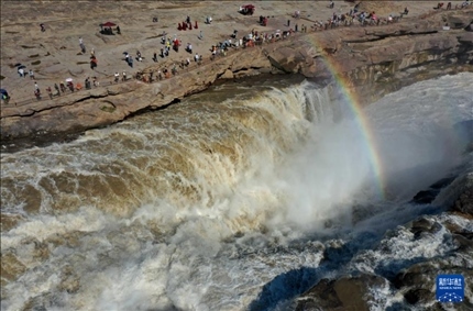 近日,受降雨影響,黃河壺口瀑布水量增大,河水翻滾而下,飛濺起的水霧在陽光的照射下,形成“彩橋通天”景觀。