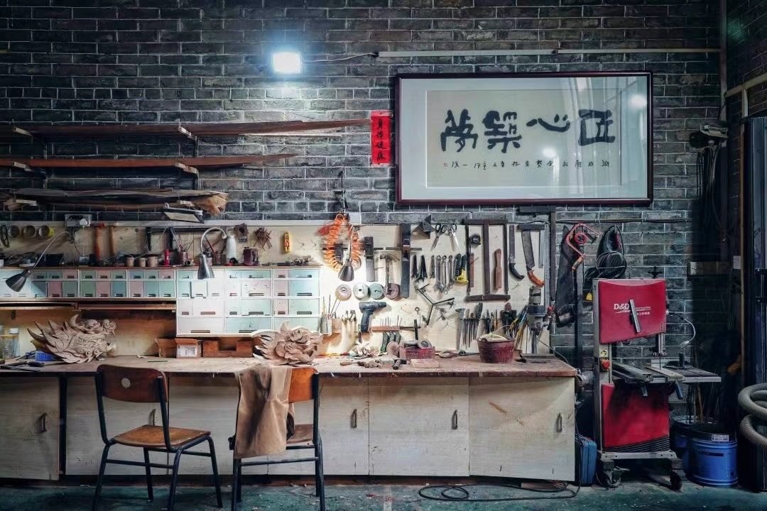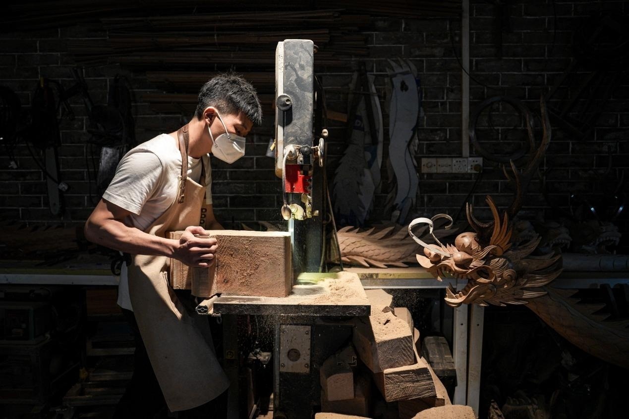 張偉潮身上的傷也沒斷過?!疤焯旄洞蚪坏?,有時(shí)候傷口剛縫了線,回到家一干活,刀口又開了”,手臂上、手背上遍布的傷疤,見證了每一個(gè)龍頭的誕生?!懊肯乱坏叮叶家呀?jīng)想好了后面的第二步、第三步”,龍頭雕刻極為考究,從選料、切割,到粗雕、精雕,再到打磨、拋光、裱漆,十幾道繁瑣工序,全靠師傅的眼光和手藝。機(jī)械化、流水線,做不出龍頭嗎?在數(shù)不清的日夜里,光影斑駁間,張偉潮拿著父輩傳下的一刀一錘,一下一下,慢慢開鑿,給出自己的答案。