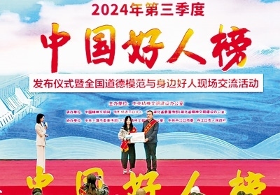 30多年堅(jiān)守海上救援的“漁家子弟”董建海,數(shù)九寒天跳入冰窟救人獻(xiàn)出生命的普通村民高元嶺,自愿守護(hù)烈士英靈43載的退伍老兵顧平,犧牲在防汛一線的90后基層干部李東,21年不離不棄照料患病親人的好兒媳王秀杰……11月12日,由中央精神文明建設(shè)辦公室主辦的2024年第三季度“中國(guó)好人榜”發(fā)布儀式暨全國(guó)道德模范與身邊好人現(xiàn)場(chǎng)交流活動(dòng)在湖北省十堰市舉辦,經(jīng)各地推薦、網(wǎng)友評(píng)議和專家評(píng)審等環(huán)節(jié),共有152人(組)助人為樂、見義勇為、誠(chéng)實(shí)守信、敬業(yè)奉獻(xiàn)、孝老愛親身邊好人光榮上榜。