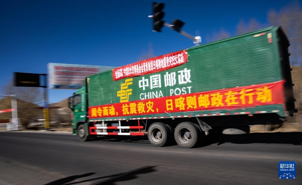 1月8日,在日喀則市境內(nèi)的318國(guó)道旁,中國(guó)郵政的抗震救災(zāi)物資運(yùn)輸車輛向震中方向駛?cè)ァ?/p>