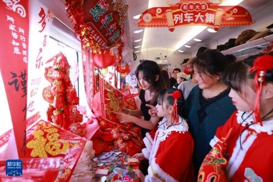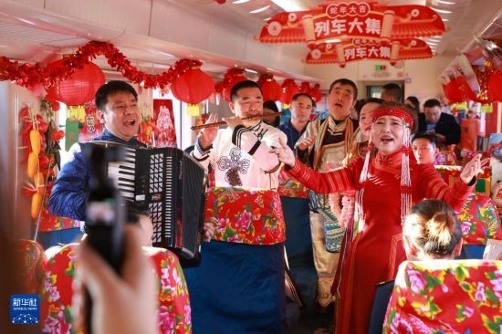 當(dāng)日,黑龍江開(kāi)啟2025年首個(gè)“列車大集”,在齊齊哈爾開(kāi)往滿洲里的4187次列車上,乘客購(gòu)年貨、品民俗、觀看非遺表演,在歸家的旅途中感受濃濃的年味。