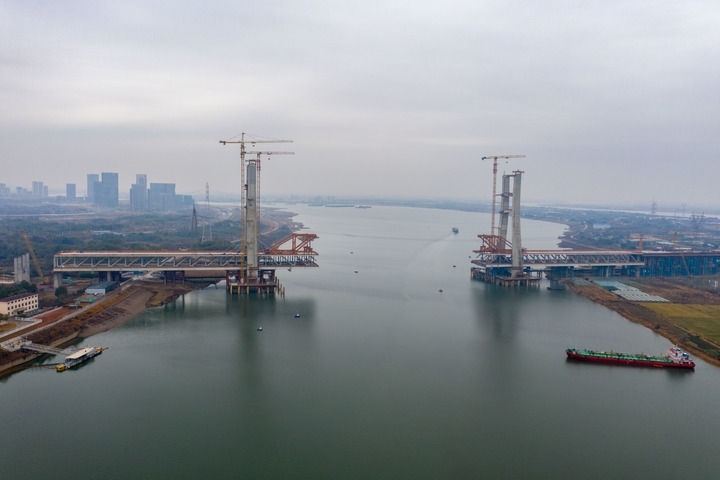 這是1月31日拍攝的昌九高鐵南昌揚(yáng)子洲贛江公鐵大橋(西支)施工現(xiàn)場(無人機(jī)照片)。新華社記者 郭杰文 攝