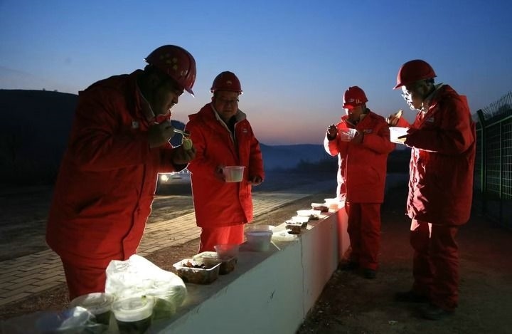 1月28日,長慶油田第二采油廠搶險隊員在井場吃了一頓特殊的“年夜飯”。新華社發(fā)