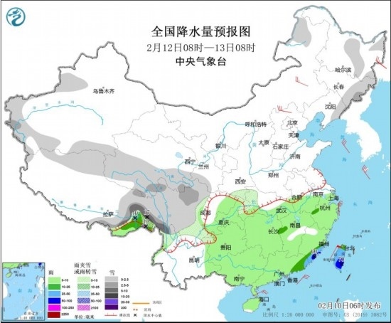 2月12日08時(shí)至13日08時(shí),內(nèi)蒙古東北部、東北地區(qū)東部、新疆伊犁河谷和西南部山區(qū)、西藏北部和東部、青海南部、川西高原、江漢西部等地部分地區(qū)有小到中雪或雨夾雪,其中,西藏東部部分地區(qū)有大雪,局地暴雪(10~17毫米)。江南大部、華南大部、西南地區(qū)東部、西藏東南部、海南島、臺(tái)灣島等地部分地區(qū)有小到中雨,其中,福建東南部、廣東東部、臺(tái)灣島等地部分地區(qū)有大到暴雨(50~70毫米)。內(nèi)蒙古大部、華北北部等地部分地區(qū)有4~6級(jí)風(fēng);黃海、巴士海峽等海域有6~7級(jí)風(fēng)。