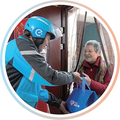 外賣(mài)騎手張魁在社區(qū)開(kāi)展助老送餐服務(wù)。