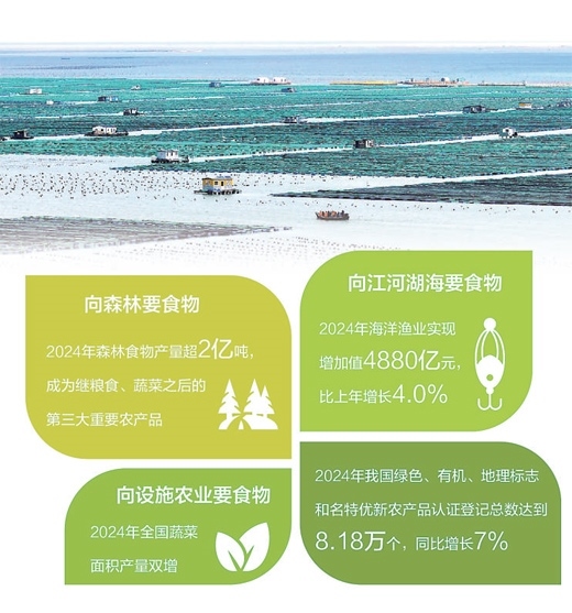 向森林要食物,2024年森林食物產(chǎn)量超2億噸,成為繼糧食、蔬菜之后的第三大重要農(nóng)產(chǎn)品。向江河湖海要食物,2024年海洋漁業(yè)實(shí)現(xiàn)增加值4880億元,比上年增長4.0%。向設(shè)施農(nóng)業(yè)要食物,2024年全國蔬菜面積產(chǎn)量雙增。