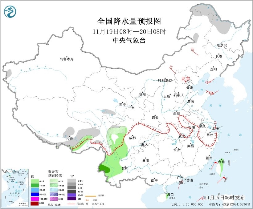 全國(guó)降水量預(yù)報(bào)圖(11月19日08時(shí)-20日08時(shí))