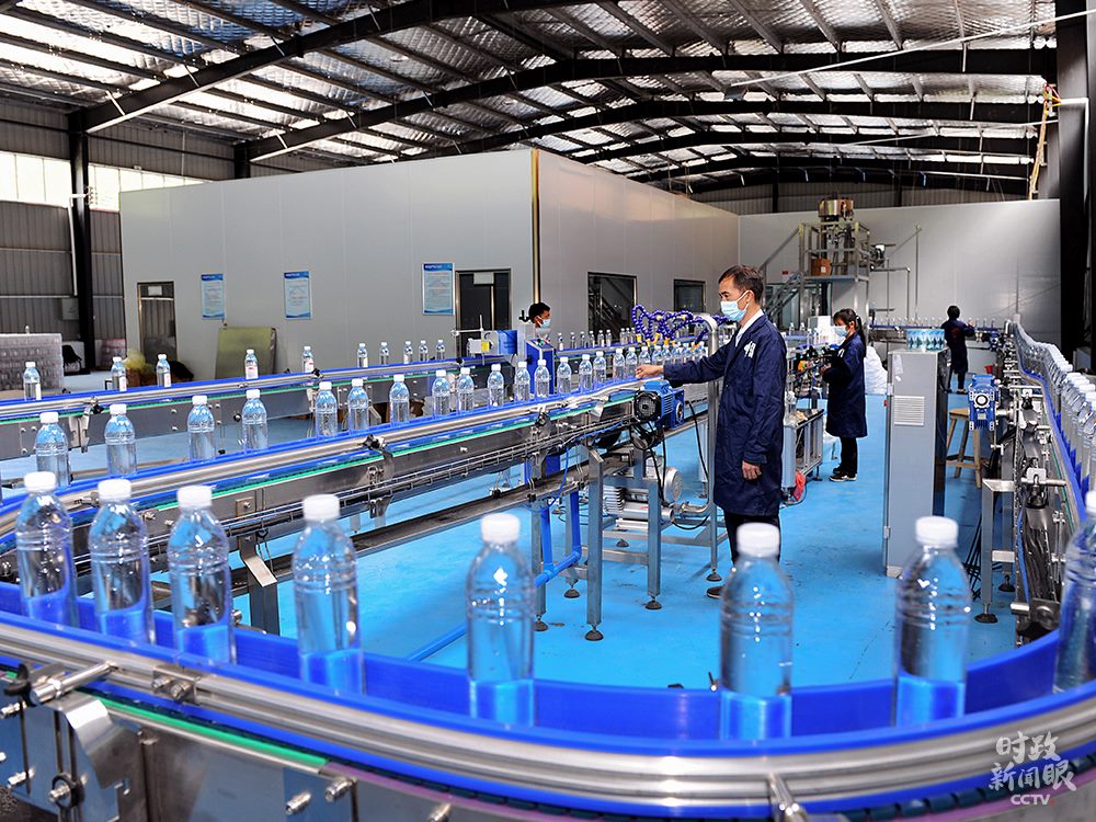△湖南邵陽市桐山鄉(xiāng)椒林村充分利用當?shù)厣饺Y源,加工生產瓶裝水。