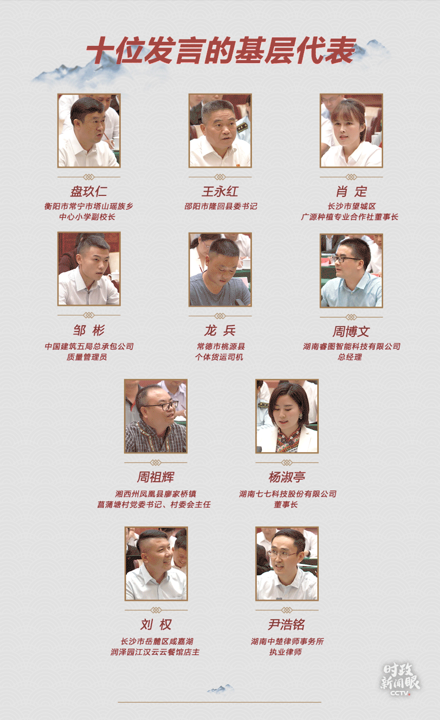 座談會上,有10位基層干部群眾代表作了發(fā)言。他們來自湖南省內的多個領域。