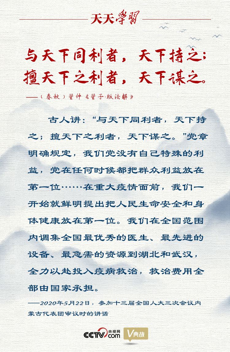 “不惜一切代價(jià)!”2020年5月22日,習(xí)近平總書(shū)記參加十三屆全國(guó)人大三次會(huì)議內(nèi)蒙古代表團(tuán)審議,在談及保護(hù)人民生命安全和身體健康時(shí)擲地有聲地說(shuō)。他在此引用了“與天下同利者,天下持之;擅天下之利者,天下謀之”這句古語(yǔ),強(qiáng)調(diào)我們黨沒(méi)有自己特殊的利益,黨在任何時(shí)候都把群眾利益放在第一位。這是我們黨作為馬克思主義政黨區(qū)別于其他政黨的顯著標(biāo)志。