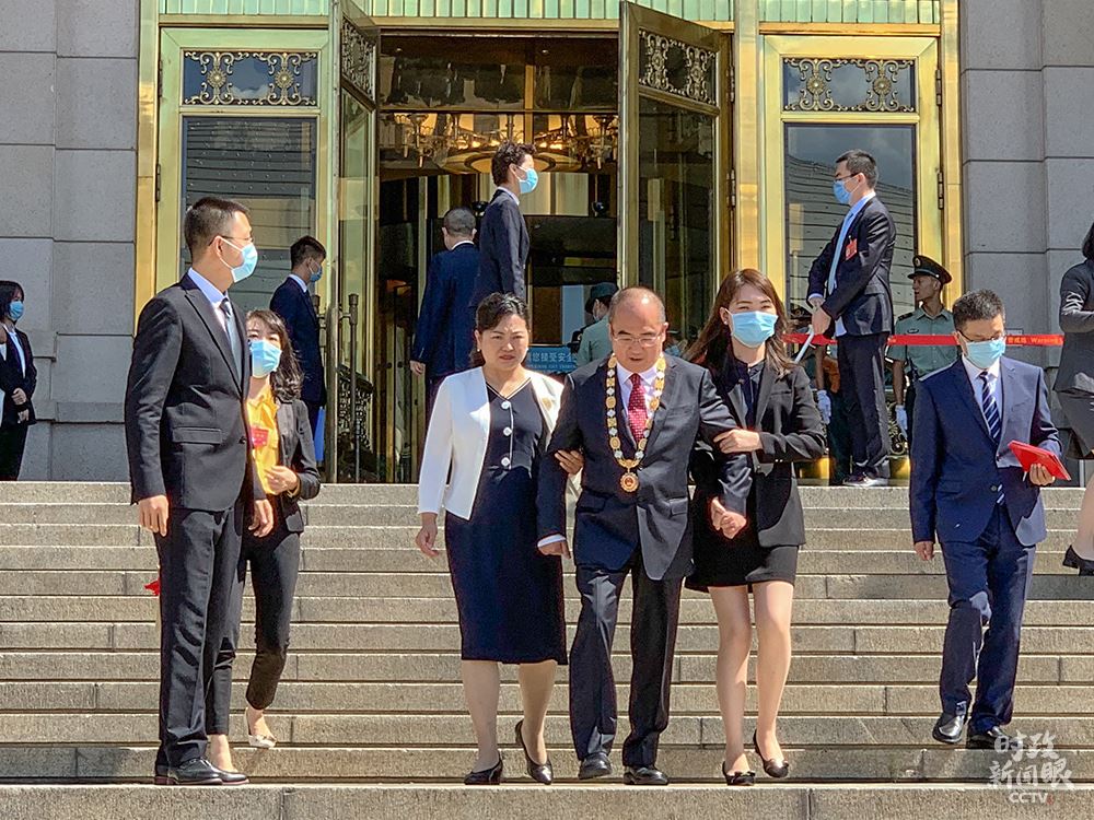 △表彰大會結束后,患有漸凍癥、行走不便的張定宇被攙扶著走出大會堂。(總臺央視記者王志明拍攝)