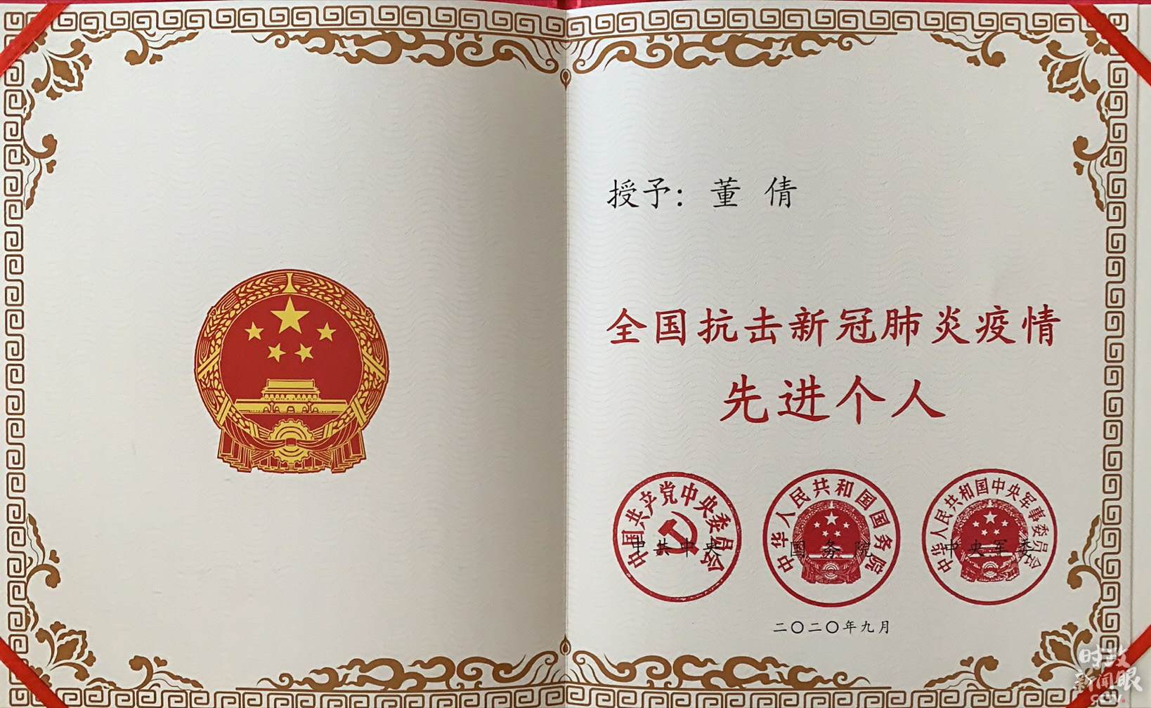 △全國抗擊新冠肺炎疫情先進個人獎章和證書。(總臺央視記者張淳拍攝)