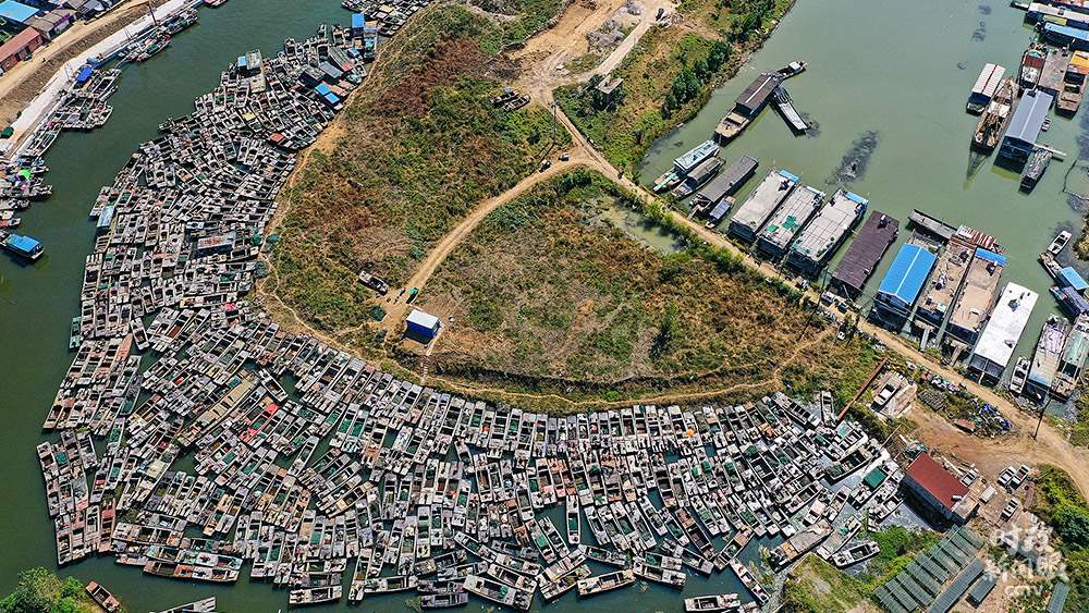 △國(guó)家實(shí)施長(zhǎng)江流域禁捕退捕政策后,江蘇宿遷泗洪縣啟動(dòng)洪澤湖水域禁捕退捕和住家船整治工作。這是聚集在漁港等待拆解的漁船。